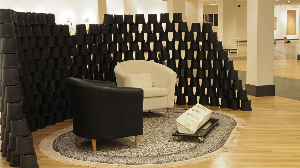 Sitzecken, "Spieltisch", ein Feld mit Tatami-Matten, ein Bild, unter dem man liegen kann, eine "Mauer", die man einreißen oder umbauen kann, ein roter Teppich mit 2 Stühlen, ein Sonnenschirm, eine Schubkarre... die Besucher dürfen viele der Elemente anfassen, damit spielen, sie betreten oder verändern. Und dabei kommt man vielleicht auf ganz unterschiedliche Gedanken.