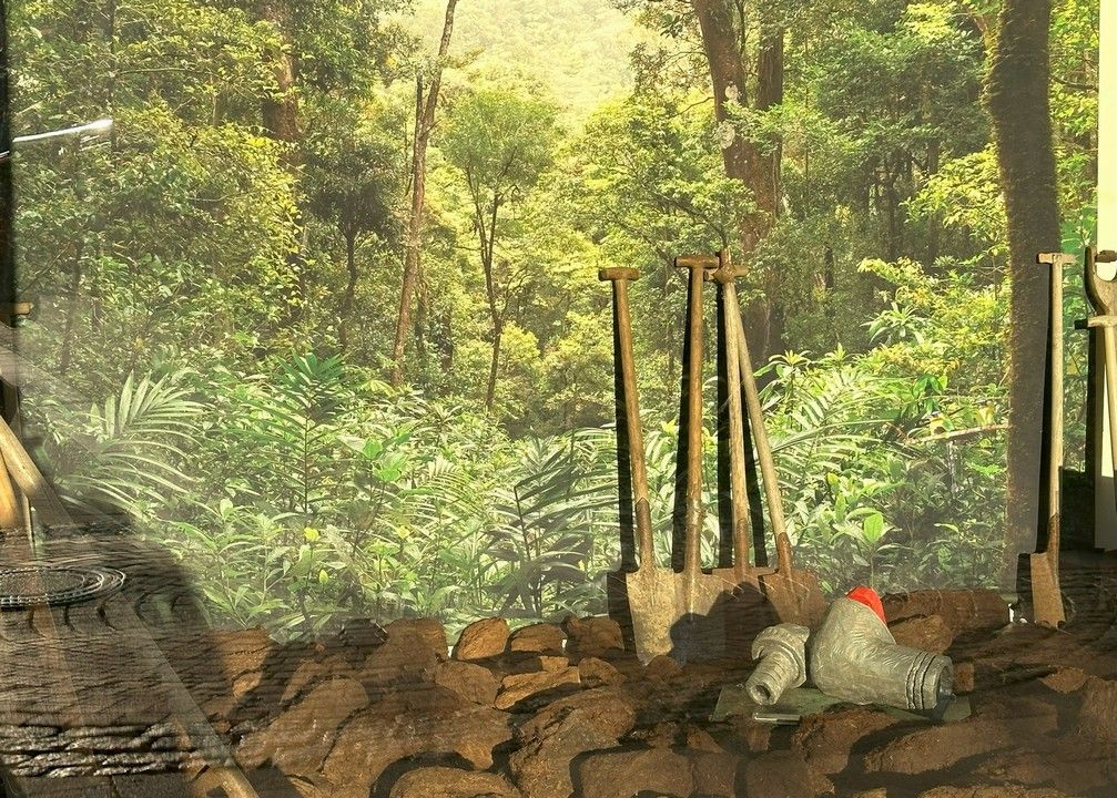 Schaufenster vorher: Urwald, Torfsoden und viele Spaten. Davor ein überdimensionaler, abgedrehter Wasserhahn.