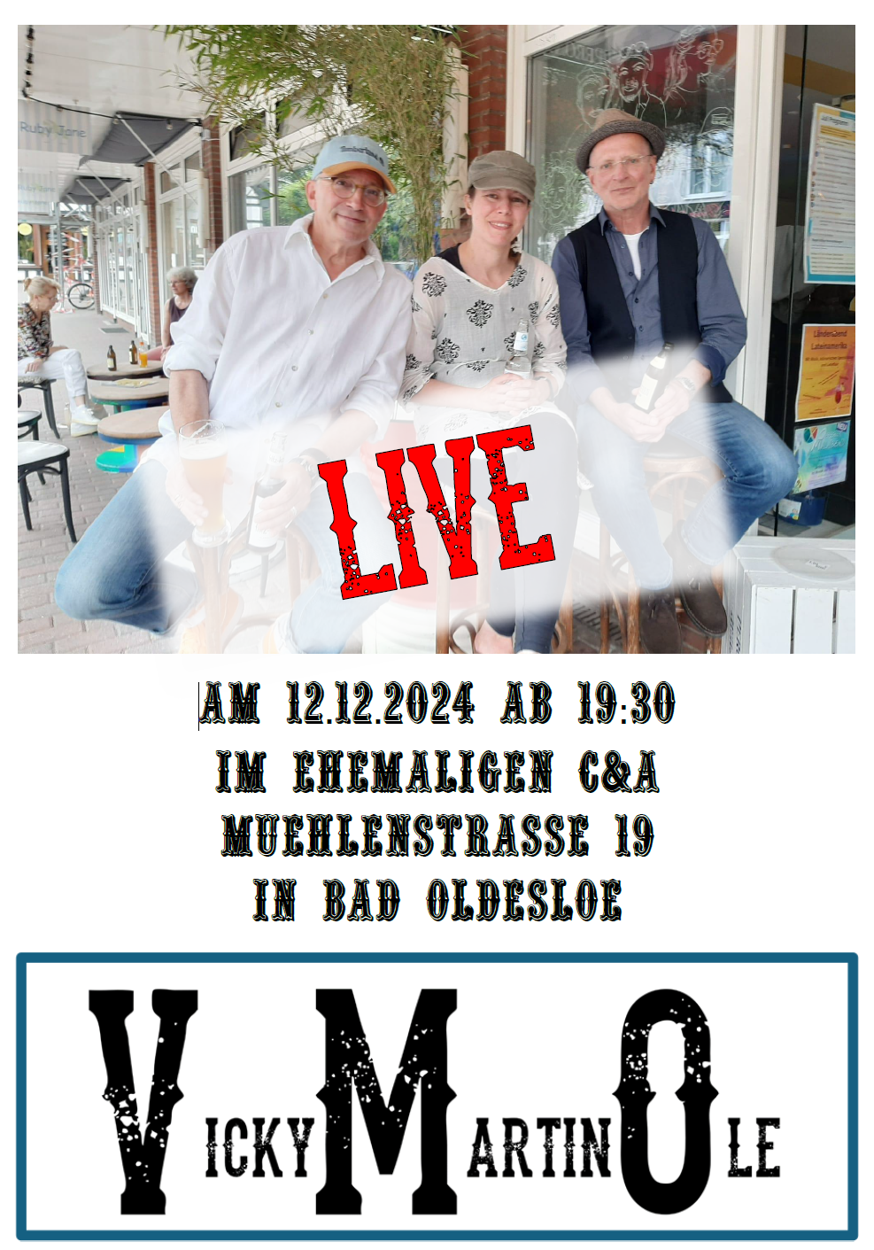 Vicky, Martin und Ole - 3 Musiker:innen, die mit Folk- und Countrymusik, amerikanischen Singer-Songwriter-Stücken gute Laune und fröhliche Stimmung in unseren Ausstellungsraum bringen. Mit mehrstimmigem Gesang und klassischer Instrumentierung mit Gitarre, Lap Steel Guitar, Bass und Mandoline klingt die Musik von V.M.O genauso, wie amerikanischer Folk klingen muss: authentisch, bewegend und einfach schön!